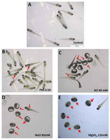 - Ord, J. Ionic Stress Prompts Premature Hatching of Zebrafish (Danio rerio) Embryos. Fishes 2019, 4, 20. [Google Scholar] [CrossRef]