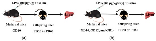 For mating purposes, four females were housed overnight with two males starting at 9:00 p.m. The detection of a vaginal plug the following morning was as an index of gestation and designated as the gestational day (GD)0. The day of birth was considered as postnatal day (PD)0. To study the effect of a single-dose LPS exposure during pregnancy on the offspring mice, dams were intraperitoneally (i.p.) injected with LPS (100 μg/kg) or saline (vehicle) on GD10, as described in Figure 1a. To investigate the effect of multiple-dose LPS exposure during pregnancy on the offspring mice, dams were administered LPS (100 μg/kg, i.p.) or saline on GD10, GD12, and GD14, as shown in Figure 1b. The single-dose LPS study and the multiple-dose LPS study were performed separately. Offspring mice were sacrificed on PD30 or PD60 (equivalent to adolescent and adult age, respectively). Liver tissues were collected, frozen rapidly in liquid nitrogen, and stored at −80 °C for further analysis.