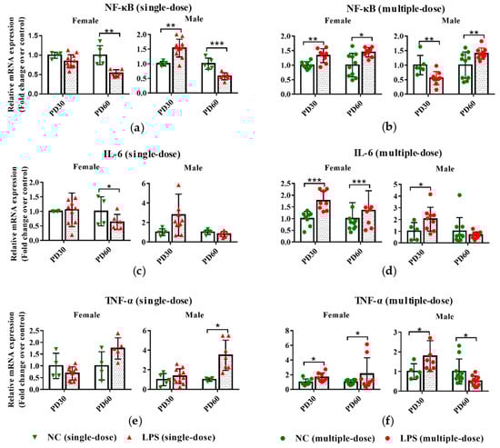 Compared with the gender and age-related control groups, maternal exposure to a single-dose LPS led to the upregulated hepatic expression of TNF-α in PD60 male offspring (Figure 2e). Conversely, maternal exposure to multiple doses of LPS resulted in downregulated hepatic expression of TNF-α in PD60 male offspring (Figure 2f). In the liver of PD30 offspring, the TNF-α expression in mRNA level was also increased in the multiple-dose LPS-treated groups compared with the control groups (Figure 2f).