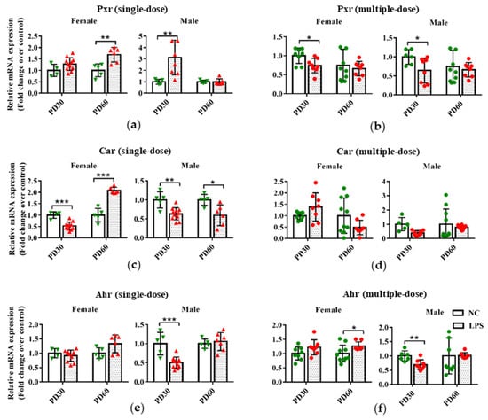 As shown in Figure 3a,b, compared with the gender and age-related control groups, PD60 female and PD30 male offspring mice in the single-dose LPS groups had a higher hepatic expression of Pxr in mRNA level, but PD30 female and PD60 male offspring mice in the multiple-dose LPS groups had lower hepatic Pxr expression.