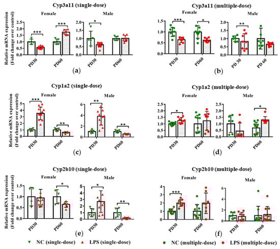 In the single-dose LPS exposure groups, the mRNA expression of Cyp1a2 was elevated in the PD30 offspring but reduced in the PD60 offspring, compared with the gender and age-related control groups (Figure 4c). Prenatal exposure to a multiple dose of LPS increased the hepatic mRNA expression levels of Cyp1a2 in PD30 female and PD60 male offspring (Figure 4d). Similarly, the mRNA expression of Cyp2b10 was also decreased in the PD60 offspring of the single-dose LPS exposure group but increased in the PD30 male offspring of the single-dose LPS exposure group and in the PD30 female offspring of the multiple-dose LPS exposure group (Figure 4e,f).