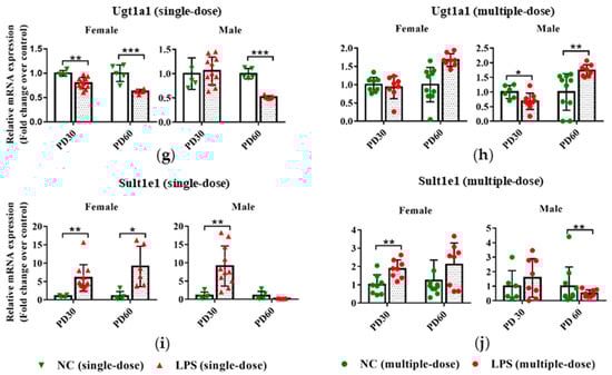 As shown in Figure 4g,i, prenatal exposure to a single dose of LPS tended to decrease the Ugt1a1 expression in PD30 female and PD60 offspring but increase the Sult1e1 expression in mRNA levels in the liver of PD30 and PD60 female offspring. In the multiple-dose groups, the mRNA expression of Ugt1a1 was altered in male offspring due to prenatal LPS exposure (Figure 4h). Higher mRNA expression of Sult1e1 in the PD30 female offspring and lower expression of it in the PD60 male offspring were observed, compared with the gender and age-related control groups (Figure 4j).