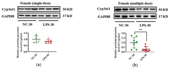 As depicted in Figure 4a,b, prenatal exposure to either a single-dose or multiple-dose LPS led to decreased mRNA expression of Cyp3a11 in the liver of PD30 female offspring. For PD60 offspring, compared with the gender and age-related control group, higher mRNA expression of Cyp3a11 was observed in female and not in male offspring delivered by single-dose LPS-treated maternal mice. Significantly lower mRNA expression of Cyp3a11 was seen in PD60 female offspring of multiple-dose LPS groups.