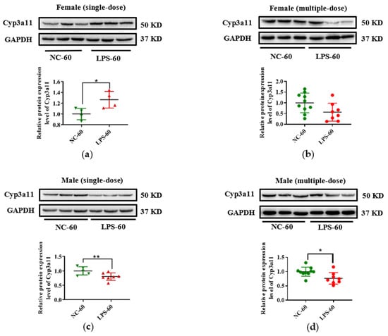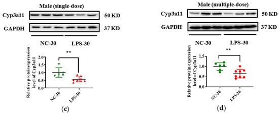 In addition, due to the vital role of human CYP3A4 in drug metabolism, Cyp3a11 was selected as a representative gene, and its expression in protein level was measured in this study. As seen in Figure 5, consistent with the decrease of Cyp3a11 in mRNA levels in LPS exposure groups, maternal exposure to either a single or multiple dose of LPS during pregnancy resulted in reduced protein expression of Cyp3a11 in the liver of PD30 offspring. For PD60 offspring mice, the alterations of Cyp3a11 expression in protein level in the single-dose LPS groups were consistent with that in mRNA level (Figure 6a,c). Moreover, in the multiple-dose LPS groups, the protein expression levels of Cyp3a11 were also significantly decreased (Figure 6b,d).