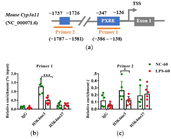 Growing evidence has demonstrated that alterations of histone modifications by environmental exposure during early life can result in persistent changes in gene expression in later life [,]. Therefore, the role of histone modifications (H3K4me3 and H3K27me3) in the decreased expression of Cyp3a11 following prenatal LPS exposure was investigated in the present study.