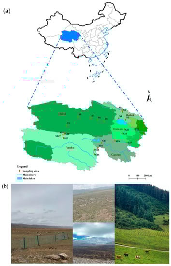 (a) Location of grassland soil sampling sites in Qinghai Province. (b) Photographs of grasslands in Qinghai Province.