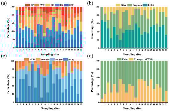 We identified five types of MP polymers in the grassland soils by Raman spectroscopy, including PE, PET, PP, PVC, and PS. The Raman spectra of the five MPs are shown in Figure S1. These polymers are also the most common types of MPs in the environment because they possess a carbon backbone that is resistant to hydrolytic and enzymatic degradation. As such, microorganisms are generally unable to assimilate and mineralize these polymers, leading to the accumulation of these materials in the environment []. As shown in Figure 3a, the contribution of each polymer type to MP contamination varied among the different sampling sites. Overall, PET was the dominant polymer type, with a contribution of 25.9%, followed by PS, PE, PVC, and PP, accounting for 22.7%, 20.4%, 19.7%, and 11.2%, respectively (Figure 4a). Previous studies found that the main polymer types of MPs varied according to different soil uses. For example, PE has been identified as the dominant MP polymer in most studies on agricultural soils [,], which could possibly be attributed to the widespread use of PE as plastic mulch in farmland.