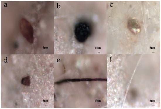 Photographs of typical MPs in the shapes of pellets (a,b), fragments (c,d), fibers (e,f).