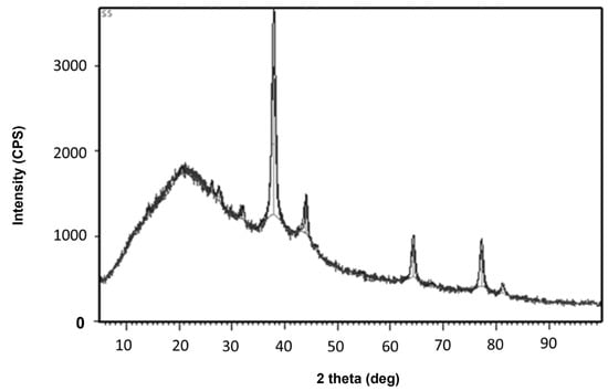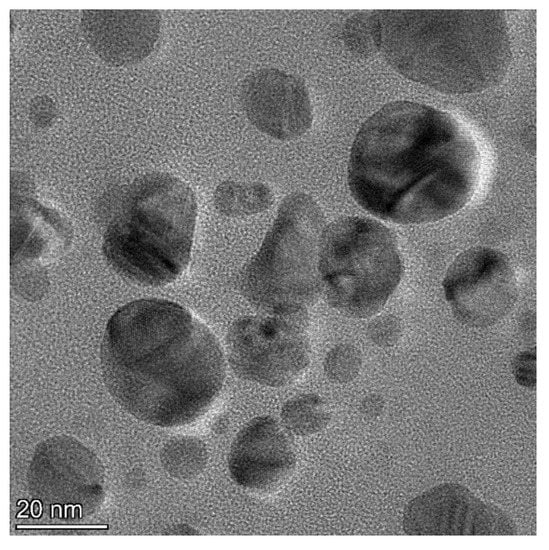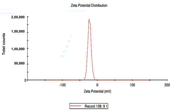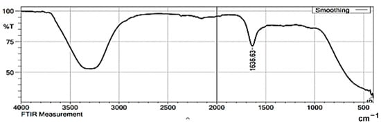 The biomolecules present in the gum solution help in capping and stabilizing the nanoparticles which were determined using Fourier Transform Infrared Spectroscopy (FTIR) studies (Figure 2). O–H stretching in the alcohols and phenols were confirmed by the prominent peak at the wavelength position at 3000–3500 cm−1. Peaks at 2400 cm−1 indicated carbonyl bond group (O=C=O) stretching. The peak at 1636 cm−1 is the strong indicator of alkenes (C=C) stretching. The Scanning Electron Microscopy (SEM) image shows a dense population of spherical, or nearly spherical, shaped nanoparticles with sizes ranging from 13 to 20 nm (Figure 3a). As previously reported, the Energy Dispersive X-Ray (EDX) spectrum (Figure 3b) showed silver with a significant signal peak at ∼3 KeV [22,26]. The silver nanoparticles synthesized using the aqueous extracts of three different stages of ripened Capsicum annum (green, yellow, red) ranged between 30 and 80 nm, which was further confirmed by Atomic Force Microscopic images [9]. Further, the shape of the synthesized silver nanoparticles was analyzed using Transmission Electron Microscopy (TEM) analysis (Figure 4), which correlated with the SEM result. The surface morphology of silver nanoparticles synthesized using aqueous extract of fresh leaves of Pedalium murex showed even shape and spherical shaped nanoparticles [27]. X-Ray Diffraction (XRD) analysis showed the peaks of 2θ at 38°, 43°, 65°, and 78° matching the JCPDS (File no.: 89—3722), which denoted that it had FCC structure [27] (Figure 5). Silver nanoparticles prepared using ethanolic extract of fruits of Santalum album were crystalline and had a face centered cubic crystal structure [28]. The Zeta Potential analysis revealed that the nanoparticles were found to be negatively charged, which implied that the particles were stable (Figure 6) [27].