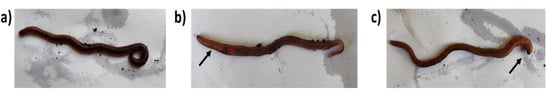 Phenotypic changes observed in earthworms exposed to silver nanoparticles. (a) control; (b) exposed to 10 µg; (c) exposed to 20 µg (Black arrow indicates the brownish pink changes).