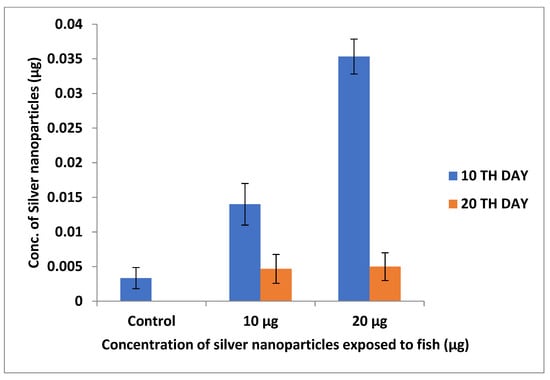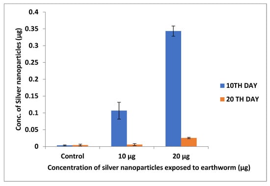 The silver deposition in earthworms and zebrafishes was investigated using ICP–OES analysis. The accumulation was observed to be greater at 20 µg concentrations due to the increased concentration of nanoparticles. Samrot et al. [22] reported that SPIONs accumulation increases with an increase in nanoparticle concentration in treated earthworms (Figure 9 and Figure 10).
