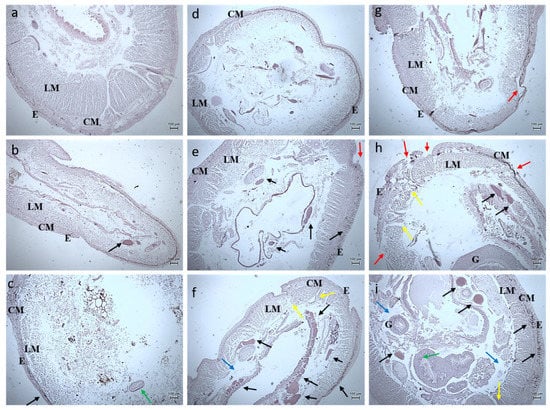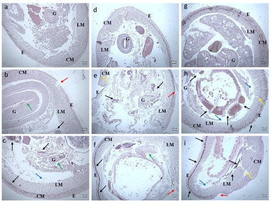 Histology images of foregut region of earthworm—Eudrilus eugeniae (10X Magnification) (a) 10th day control, (b) exposed to 10 µg at 10th day, (c) exposed to 20 µg at 10th day; (d) 20th day control, (e) exposed to 10 µg at 20th day, (f) exposed to 20 µg at 20th day; (g) 30th day control, (h) exposed to 10 µg at 30th day, (i) exposed to 20 µg at 30th day. G—Gut, E—Epidermis, LM—Longitudinal Muscle, CM—Circular Muscle. Black arrow denotes lipofuscin, red arrow denotes erosion of epidermis, blue arrow denotes interstitial space, yellow arrow denotes fibrosis of CM, green denotes arrow disruption of gut.
