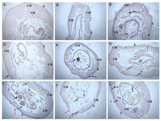 Histology images of hindgut region of earthworm—Eudrilus eugeniae (10X Magnification) (a) 10th day control, (b) exposed to 10 µg at 10th day, (c) exposed to 20 µg at 10th day; (d) 20th day control, (e) exposed to 10 µg at 20th day, (f) exposed to 20 µg at 20th day; (g) 30th day control, (h) exposed to 10 µg at 30th day, (i) exposed to 20 µg at 30th day. E—Epidermis, LM—Longitudinal Muscle, CM—Circular Muscle. Black arrow denotes lipofuscin, red arrow denotes erosion of epidermis, blue arrow denotes interstitial space, yellow arrow denotes fibrosis of CM.