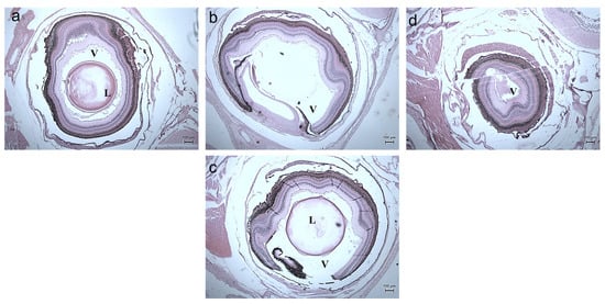 Histology images of eyes of Zebrafish—Danio rerio (10X Magnification) (a) 10th day Control, (b) 20th day Control, (c) exposed to 10 µg at 20th day, (d) 30th day Control. L–Lens, V–Vitreous.