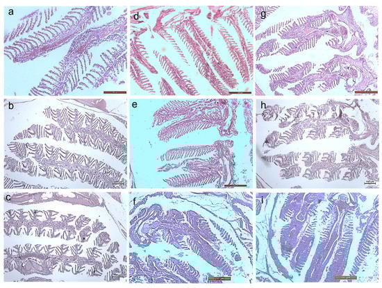 Histology images of gills of Zebrafish—Danio rerio (10X Magnification) (a) 10th day control, (b) exposed to 10 µg at 10th day, (c) exposed to 20 µg at 10th day; (d) 20th day control, (e) exposed to 10 µg at 20th day, (f) exposed to 20 µg at 20th day; (g) 30th day control, (h) exposed to 10 µg at 30th day, (i) exposed to 20 µg at 30th day.