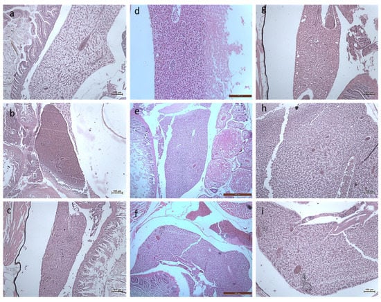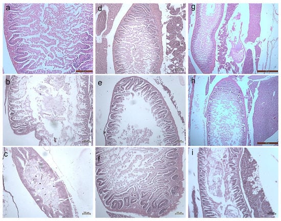 Histology images of intestines of Zebrafish—Danio rerio (10X Magnification) (a) 10th day control, (b) exposed to 10 µg at 10th day, (c) exposed to 20 µg at 10th day; (d) 20th day control, (e) exposed to 10 µg at 20th day, (f) exposed to 20 µg at 20th day; (g) 30th day control, (h) exposed to 10 µg at 30th day, (i) exposed to 20 µg at 30th day.