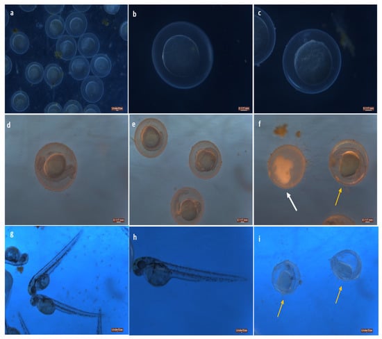 Microscopic images of Zebrafish—Danio rerio embryos (a) control at 0th h, (b) exposed to 10 µg at 0th h, (c) exposed to 20 µg at 0th h, (d) control at 24 hpf, (e) exposed to 10 µg at 24 hpf, (f) exposed to 20 µg at 24 hpf, (g) control at 48 hpf, (h) exposed to 10 µg at 48 hpf, (i) exposed to 20 µg at 48 hpf. White arrow denotes dead embryos (coagulation); Yellow arrows denote undeveloped embryos.