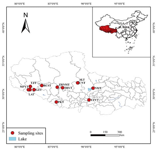 In July 2021, a total of 36 surface sediment samples (0–10 cm) were collected from 12 lakes in Tibet using the Peterson sediment sampler (Figure 1). The sampling sites were in the heart of the lakes, where anthropogenic impacts are low and where the catchment of the lake can be maximized. Three samples were replicated at each site (each sample was spaced 1 m apart), and samples were immediately stored in labeled, self-sealing polyethylene bags and kept in an ice box at 4 °C before being transported back to the laboratory for analysis.