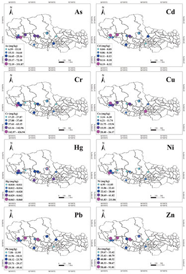 - Li, Z.; Liu, J.; Chen, H.; Li, Q.; Yu, C.; Huang, X.; Guo, H. Water environment in the Tibetan Plateau: Heavy metal distribution analysis of surface sediments in the Yarlung Tsangpo River Basin. Environ. Geochem. Health 2020, 42, 2451–2469. [Google Scholar] [CrossRef]