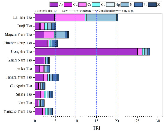 The TRI of sediments in the research area ranged from 2.34 (Nam Tso) to 28.09 (Gongzhu Tso), with a mean value of 7.84. Only Gongzhu Tso (28.09) and La’ ang Tso (20.25) showed high TRI values (Figure 3), which indicated that heavy metals from these two lakes might pose a high toxicity risk to aquatic organisms. However, Tangra Yum Tso (5.88), Rinchen Shup Tso (5.55), Mapam Yum Tso (8.19), and Tuo ji Tso (5.12) presented low toxicity risks. In addition, the remaining lakes with TRI values of less than 5 were considered, as the heavy metal content in the lakes may not pose a toxic risk to aquatic organisms. As contributed the most to the total TRI value for Gongzhu Tso. For La’ ang Tso, Cr contributed the most to the overall TRI value for La’ ang Tso, followed by Ni and As (Figure 3).