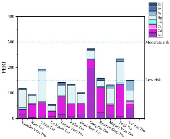 The potential ecological risk factors () are shown in Table S6. The pollution degree of eight heavy metals decreased in the following order: Hg (51.10) > Cd (50.50) > As (30.15) > Ni (6.30) > Pb (4.29) > Cu (3.78) > Cr (2.39) > Zn (0.75). The values of Cr, Ni, Zn, Pb, Ni, and Cu in the surface sediments of the 12 lakes in this study are all below 40, which was classed as a low degree of potential ecological risk. For Cd, the in Nam Tso, Siling Tso, Tangra Yum Tso, and Peiku Tso posed a moderate risk, with between 40 and 80. In addition, the values for Cd in Rinchen Shup Tso (97.94) and Tuo ji Tso (123.45) were also at a considerable risk level. For Hg, the values in Yamzho Yum Tso, Peiku Tso, Mapam Yum Tso, and La’ ang Tso appear to pose a moderate risk, with values between 40 and 80. However, the values for Hg in Tuo ji Tso (83.33) and Siling Tso (119.87) posed a considerable risk.