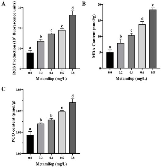 ROS production, MDA content, and PCO content all increased with the increasing metamifop concentration (Figure 1). In addition, the three indexes of the treatment groups were all significantly higher than those of the control group (p < 0.05).