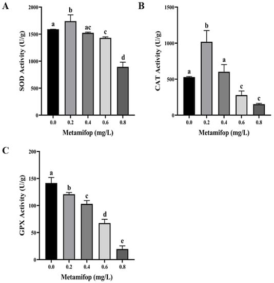 Effects of metamifop on antioxidation in Monopterus albus. (A) SOD activity; (B) CAT activity; (C) GPX activity. The data are presented as mean ± SD, three replicates of each group (n = 3). Different labels indicate significant differences between experimental groups (p < 0.05).
