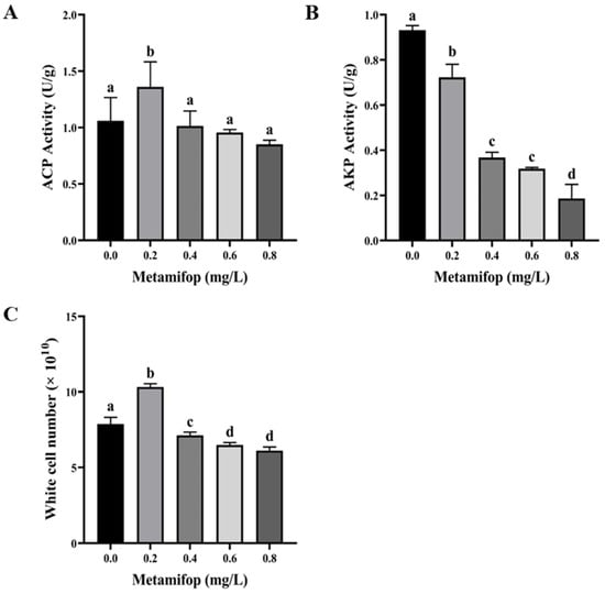Effects of metamifop on immunity in Monopterus albus. (A) ACP activity; (B) AKP activity; (C) white cell number. The data are presented as mean ± SD, three replicates of each group (n = 3). Different labels indicated that there were significant differences between experimental groups (p < 0.05).