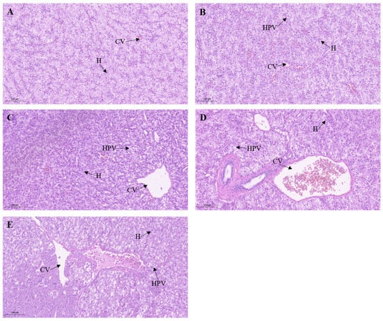 Liver tissues were fixed in a 4% paraformaldehyde solution for 24 h. The fixing solution was cleared with 70% ethanol. Then, the samples were dehydrated with 70% ethanol for 40 min, 80% ethanol for 40 min, 95% ethanol for 1 h, and 100% ethanol for 1 h. After dehydrating, the samples were soaked in a mixture of xylene and ethanol (1:1) for 30 min, and then in xylene for 1 h. The processed samples were embedded in paraffin at 55 °C, followed by sectioning and baking, and 5 µm paraffin sections were obtained. Then, a part of each section was stained with hematoxylin & eosin (H&E), sealed with natural gum, and finally observed under a light microscope (Leica DM2000 LED, Leica Instruments Co., Ltd., Wetzlar, Germany) and photographed with a 3DHISTECH scanner (Jinan Tangier Electronics Co., Ltd., Jinan, China).