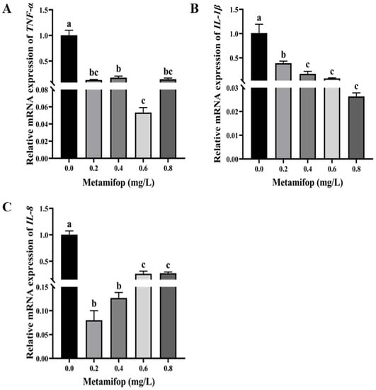 Effects of metamifop on expression level of inflammation-related genes in Monopterus albus. (A) expression of TNF-α; (B) expression of IL-1β; (C) expression of IL-8. The data are presented as mean ± SD, three replicates of each group (n = 3). Different labels indicated that there were significant differences between experimental groups (p < 0.05).