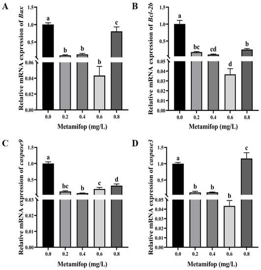 Effects of metamifop on expression level of apoptosis-related genes in Monopterus albus. (A) expression of Bax; (B) expression of Bcl-2b; (C) expression of caspase-9; (D) expression of caspase-3. The data are presented as mean ± SD, three replicates of each group (n = 3). Different labels indicated that there were significant differences between experimental groups (p < 0.05).