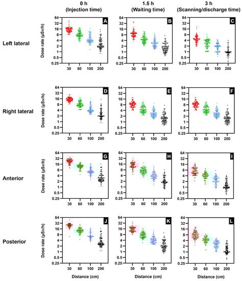 Scatter plot illustrating the data relationship between dose rate (µSv/h) and distance at 30, 60, 100, and 200 cm at 0 h (injection time), 1.5 h (waiting time), and 3 h (scanning/discharge time). Left lateral: (A) 0 h, (B) 1.5 h, (C) 3 h. Right lateral: (D) 0 h, (E) 1.5 h, (F) 3 h. Anterior: (G) 0 h, (H) 1.5 h, (I) 3 h. Posterior: (J) 0 h, (K) 1.5 h, (L) 3 h. Data are shown as total values with mean ± standard deviation (n = 100).