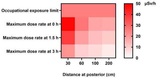 Furthermore, the heat map in Figure 3 similarly illustrates the maximum dose rates emitted from patients at various distances and time points, highlighting the distances and times when nuclear medicine staff are potentially at the most significant risk of radiation exposure.