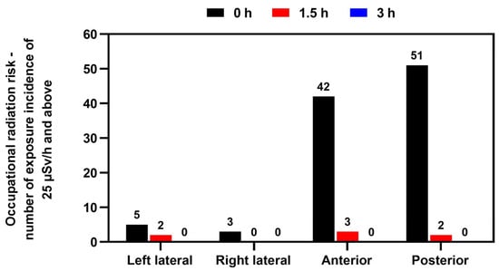 Occupational radiation risk incidence over exposure limit of 25 µSv/h and above at 0 h (time of injection), 1.5 h, and after 3 h on completion of the bone scintigraphy at left lateral, right lateral, anterior, and posterior positions. The International Commission on Radiological Protection (ICRP) 75, “General Principles for the Protection of Workers”, proposes an effective dose limit of 20 mSv/y (averaged over five consecutive years) and a maximum of 50 mSv/y in any single year. Working 40 h per week for 50 weeks per year results in an occupational hourly dose rate of 25 μSv/h. Data are given as total incidences of occupational radiation risk over the exposure limit of 25 µSv/h and above (n = 100).