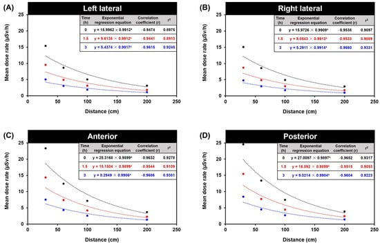 Forecasting dose based on distance and time after injection in exponential regression equation. The mean dose rate relationship between distance and time: (A) left lateral, (B) right lateral, (C) anterior, (D) posterior. The exponential regression equation is shown in where y is mean dose rate (μSv/h) and x is the distance from the patient (cm).