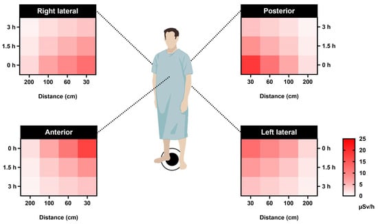 Moreover, Figure 2 shows the maximum dose rate declining as a result of increasing the distance and time, with a significant difference at all distances and times (p < 0.05). Additionally, the maximum dose data determined that the left lateral maximum doses were reduced by ~60% from 30 to 200 cm and the right lateral were reduced by ~44%. The left lateral maximum dose reduction from 0 to 3 h was ~52%, and the right lateral reduction was ~59%. Furthermore, the anterior maximum dose was reduced by ~57% from 30 to 200 cm, and the reduction from 0 to 3 h was ~51%. Similarly, the posterior maximum dose was reduced by ~66% from 30 to 200 cm, and the reduction from 0 to 3 h was ~59%.
