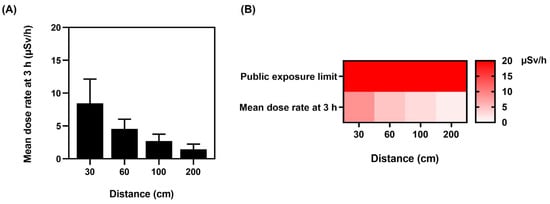 Public exposure limits. (A) Mean dose rate at distances of 30, 60, 100, and 200 cm from patient after 3 h on completion of the bone scintigraphy. (B) Public exposure limit heat map showing the comparison between mean dose rates at distances of 30, 60, 100, and 200 cm after 3 h on completion of the bone scintigraphy. In an unrestricted area, the United States Nuclear Regulatory Commission (NRC) specifies in Title 10 of the Code of Federal Regulations (CFR) Section 20 that the dose from external sources cannot exceed the reference level of 0.002 rem (0.02 mSv) per hour (20 μSv/h). Data are given as mean ± standard deviation (n = 100).