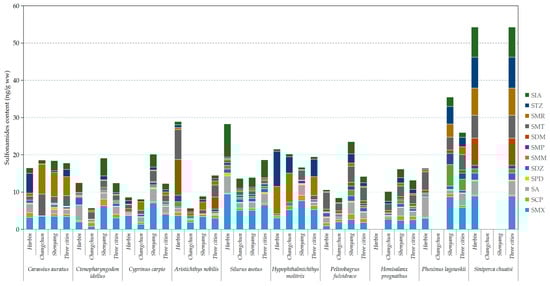 Sulfonamides have been detected to varying degrees in Chinese freshwater bodies, and in aquatic food products extracted from these water bodies, for example in Taihu Lake, Dongting Lake, and the Xiangjiang River [,,], mainly including sulfamethoxazole, sulfadiazine, sulfadoxine, and sulfapyridine. At present, few studies have been conducted on antibiotic residues in freshwater fish from northeastern China. Therefore, it is necessary to detect antibiotic residues in major edible fish species in this region and assess their health risks. In the present study, a total of 10 commercially available fish species were purchased in Shenyang, Changchun, and Harbin, respectively, and the levels of 12 sulfonamide antibiotics in edible fish were examined and their health risks were evaluated.