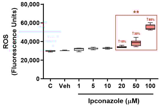 EA.hy926 endothelial cells were exposed to the fungicide ipconazole for 24 h to assess whether this compound is able to generate oxidative alterations, which was measured by the intracellular ROS generation. It was observed that ipconazole significantly (** p < 0.01) increased ROS generation at concentrations of 20 (15%), 50 (30%) and 100 (85%) µM, reflecting that it acted as a pro-oxidant substance (Figure 3).