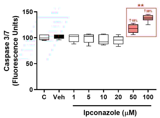 Enzymatic activity of caspase 3/7 by the fungicide ipconazole. Concentrations of 50 and 100 µM ipconazole significantly increased caspase 3/7 enzymatic activity in EA.hy926 cells after a 24 h exposure period. Data are presented as percentage of control and mean ± SD of six replicates. Concentrations of ipconazole (red boxes) show significant differences (** p < 0.01) compared to vehicle (Veh; black box).