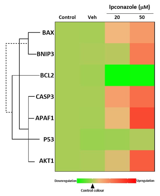 Using qPCR molecular analysis, we assessed whether the molecular expression of cell death biomarkers was altered by ipconazole in EA.hy926 cells. Ipconazole at concentrations of 20 and 50 µM resulted in a significant increase in the molecular expression of BAX (1.39- and 1.73-fold, respectively) and CASP3 (1.66- and 2.24-fold, respectively). In addition, only the highest concentration of ipconazole (50 µM) increased the molecular expression of APAF1 (2.66-fold), BNIP3 (2.08-fold) and AKT1 (2.42-fold), compared to vehicle (Table 2). However, ipconazole at concentrations of 20 and 50 µM down-regulated BCL2 gene expression by 0.13-fold and 0.16-fold, respectively. These data suggested a possible apoptotic effect of ipconazole exposure on EA.hy926 endothelial cells (Table 2). Figure 5 shows the heat map of the direct or inverse association between cell-death-related genes that were up- or down-regulated by ipconazole.