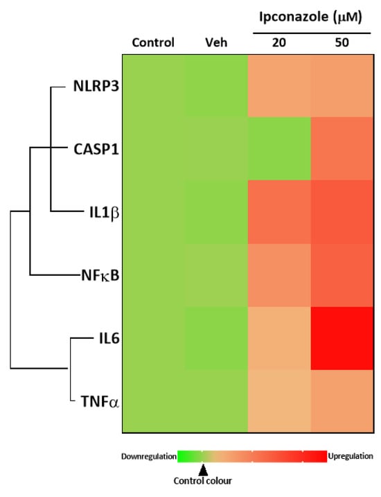 In this study, the gene expression of molecules involved in the activation, formation and response of the inflammasome complex was assessed by qPCR. In EA.hy926 endothelial cells exposed to ipconazole for 24 h, it was observed that at concentrations of 20 and 50 µM it produced a significant increase in the molecular expression of IL1β by 2.14- and 2.41-fold, respectively, compared to vehicle. Furthermore, only the highest concentration of ipconazole (50 µM) produced an increase in the molecular expression of NLRP3 (1.59-fold), CASP1 (2.07-fold), NFκB (2.31-fold), IL6 (3.34-fold) and TNFα (1.56-fold), compared to vehicle (Table 3). Figure 6 shows the heat map of the direct associations among the inflammasome-complex-related genes that were up-regulated by ipconazole.