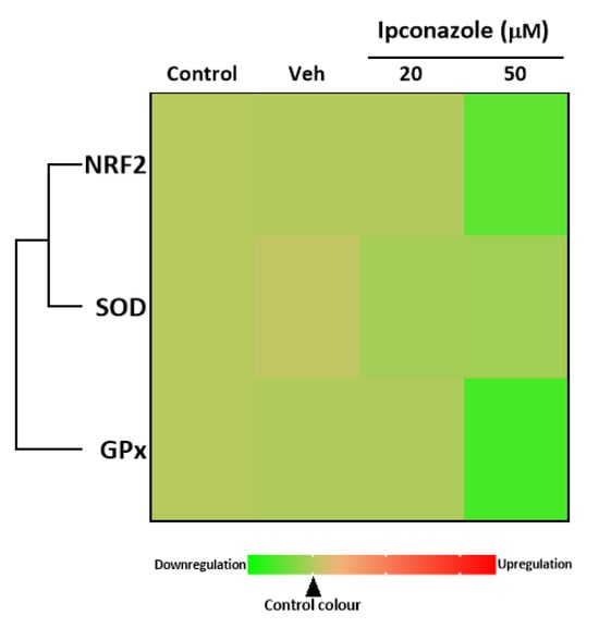 The importance of studying the molecular expression of antioxidants lies in the fact that these molecules can maintain or restore homeostasis, which may be altered because of a cellular challenge. In the present study, it was observed that ipconazole (50 µM) produced a significant decrease in NRF2 (0.56-fold) and GPx (0.45-fold) expression, compared to the vehicle (Table 4). Figure 7 shows the heat map of the direct associations among the antioxidant-related genes that were up-regulated by ipconazole. These data may indicate that elevated ROS production or other mechanisms involved may be attenuating or depleting the cellular antioxidant pathway.