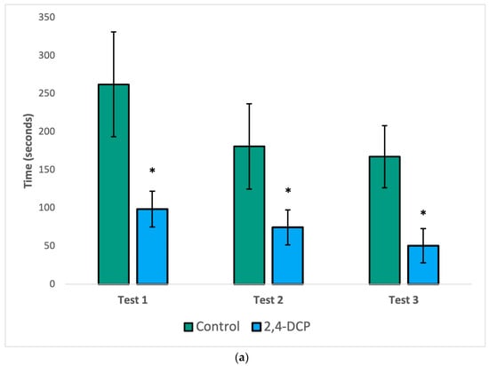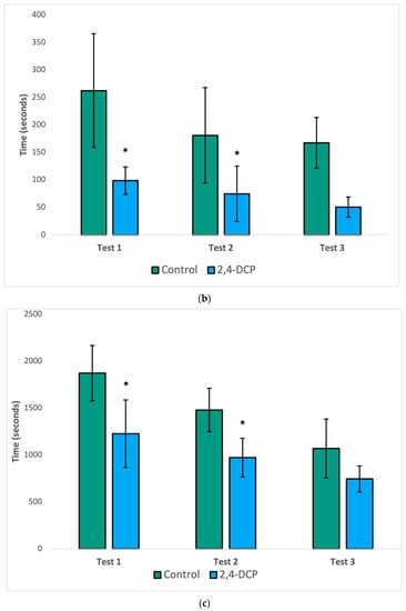 As seen in Figure 1, the mount latency (a), intromission latency (b), and post ejaculatory period (c) of 2,4-DCP-treated males were significantly reduced compared to control animals. In all three figures, a general decline in the parameter being analyzed was observed in both groups with each subsequent test. This is to be expected because as each test is repeated, the sexually naïve male rats gain experience and become more efficient in mating behaviors. Despite this general decline, statistically significant differences were still appreciated in all three tests for mount latency, as well as in the first two tests for intromission latency and the post ejaculatory period.
