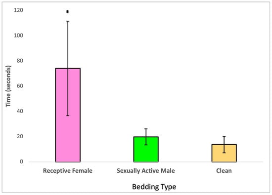 Upon further analysis with a Bonferroni post hoc test, it became evident that the males treated with 2,4-DCP exhibited a preference for estrus bedding (soiled bedding from receptive females) over both anestrous bedding and soiled bedding from sexually active males, as illustrated in Figure 2. Additionally, this analysis indicated that the time these treated males spent sniffing soiled bedding from sexually active males compared to clean bedding was not significantly different.