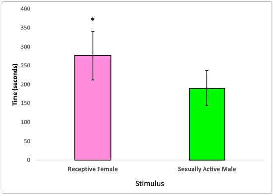 In this section, we examined the partner preference behavior of treated male subjects, taking into account the social nature of rats. Specifically, we assessed whether male rats exposed to 2,4-DCP would spend more time with receptive females or sexually active males. Our analysis, conducted using a paired t-test, revealed statistically significant differences in the time 2,4-DCP-treated males spent with receptive females compared to the time they spent with sexually active males. These findings are visually represented in Figure 3.