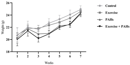 The initial weights of the animal groups did not show significant differences (p = 0.909). The mean weights were as follows: control group 19.58 ± 0.93 g, exercise group 19.00 ± 0.56 g, PAHs group 19.33 ± 0.74 g, and exercise + PAHs group 18.75 ± 0.70 g. Weekly weight measurements were taken, showing a non-significant difference between groups (p = 0.560). However, each group demonstrated a statistically significant increase in weight (p < 0.0001) throughout the course of the protocol (Figure 1).