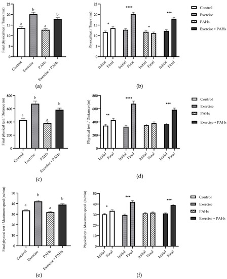 The initial physical capacity test did not show statistically significant differences in distance (p = 0.570), time (p = 0.590), or maximum speed (p = 0.484). Referring to the comparison between the groups in the final physical capacity test, it showed differences for all variables (p < 0.0001). Regarding the analysis before and after the intervention of physical capacity, it showed differences in test time in all groups (control p = 0.022; exercise p < 0.0001; PAHs p = 0.048; exercise + PAHS p = 0.0001), distance in all groups except PAHs (control p = 0.005; exercise p < 0.0001; PAHs p = 0.058; exercise + PAHS p = 0.0001), and speed in all groups except PAHs (control p = 0.031; exercise p = 0.001; PAHs p = 0.594; exercise + PAHS p = 0.001) (Figure 2).