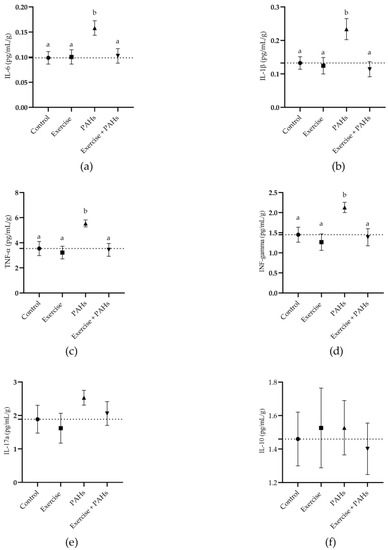 Comparison of weight-adjusted serum inflammatory cytokine quantification between groups. (a) IL-6 p = 0.017 (control vs. exercise p = 0.999; control vs. PAHs p = 0.022; control vs. exercise + PAHs p = 0.997; exercise vs. PAHs p = 0.033; exercise vs. exercise + PAHs p = 0.999; PAHs vs. exercise + PAHs p = 0.035). (b) IL-1β p = 0.005 (control vs. exercise p = 0.996; control vs. PAHs p = 0.029; control vs. exercise + PAHs p = 0.951; exercise vs. PAHs p = 0.020; exercise vs. exercise + PAHs p = 0.991; PAHs vs. exercise + PAHs p = 0.009). (c) TNF-α p = 0.005 (control vs. exercise p = 0.968; control vs. PAHs p = 0.036; control vs. exercise + PAHs p = 0.999; exercise vs. PAHs p = 0.009; exercise vs. exercise + PAHs p = 0.988; PAHs vs. exercise + PAHs p = 0.016). (d) IFN-gamma p = 0.006 (control vs. exercise p = 0.892; control vs. PAHs p = 0.045; control vs. exercise + PAHs p = 0.995; exercise vs. PAHs p = 0.009; exercise vs. exercise + PAHs p = 0.968; PAHs vs. exercise + PAHs p = 0.031). (e) IL-17A p = 0.396. (f) IL-10 p = 0.954. Data are presented as mean ± SEM. The dashed line represents the mean value of the control group. Different letters show statistically significant differences. Ordinary one-way ANOVA with Tukey’s multiple comparison test. (n = 10 per group).
