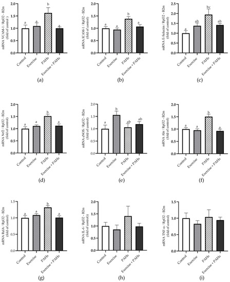 Relative gene expression in aortic tissue of markers of endothelial dysfunction, REDOX imbalance, and inflammation. (a) VCAM-1 p = 0.005 (control vs. exercise p = n.s.; control vs. PAHs p = 0.008); control vs. exercise + PAHs p = n.s.; exercise vs. PAHs p = 0.044; exercise vs. exercise + PAHs p = ns; PAHs vs. exercise + PAHs p = 0.019) K-W. (b) ICAM-1 p = 0.001 (control vs. exercise p = n.s.; control vs. PAHs p = 0.007; control vs. exercise + PAHs p = n.s.; exercise vs. PAHs p = 0.002; exercise vs. exercise + PAHs p = n.s.; PAHs vs. exercise + PAHs p = 0.033) A. (c) E-selectin p = 0.029 (control vs. exercise p = n.s.; control vs. PAHs p = 0.045; control vs. exercise + PAHs p = n.s.; exercise vs. PAHs p = n.s.; exercise vs. exercise + PAHs p = n.s.; PAHs vs. exercise + PAHs p = n.s.) W-A. (d) Nrf2 p < 0.0001 (control vs. exercise p = n.s.; control vs. PAHs p = 0.0001; control vs. exercise + PAHs p = n.s.; exercise vs. PAHs p = 0.002; exercise vs. exercise + PAHs p = n.s.; PAHs vs. exercise + PAHs p = 0.002) A. (e) eNOS p = 0.038 (control vs. exercise p = 0.037; control vs. PAHs p = n.s.; control vs. exercise + PAHs p = n.s.; exercise vs. PAHs p = n.s.; exercise vs. exercise + PAHs p = n.s.; PAHs vs. exercise + PAHs p = n.s.) A. (f) Ahr p = 0.0004 (control vs. exercise p = n.s.; control vs. PAHs p = 0.030; control vs. exercise + PAHs p = n.s.; exercise vs. PAHs p = 0.005; exercise vs. exercise + PAHs p = n.s.; PAHs vs. exercise + PAHs p = 0.0007) K-W. (g) RelA p = 0.002 (control vs. exercise p = n.s.; control vs. PAHs p = 0.003; control vs. exercise + PAHs p = n.s.; exercise vs. PAHs p = 0.041; exercise vs. exercise + PAHs p = n.s.; PAHs vs. exercise + PAHs p = 0.003) A. (h) IL-6 (p = 0.582) K-W. (i) TNF-α (p = 0.849) K-W. Relative quantification was calculated using the reference genes RPL32 and B2m. Data are presented as mean ± SEM. Different letters show statistically significant differences. A Ordinary one-way ANOVA with Tukey’s multiple comparisons test. W-A Welch’s ANOVA test with Games-Howell’s multiple comparison test. K-W Kruskal–Wallis with Dunn’s test multiple comparison analysis. (n = 10 per group).